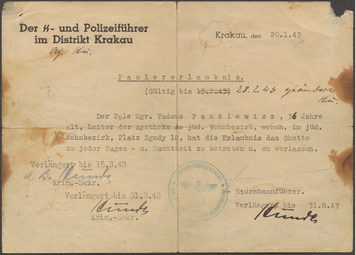 Passierschein für Tadeusz Pankiewicz © Historisches Museum Krakau 2003 P 69 58 R. 3614