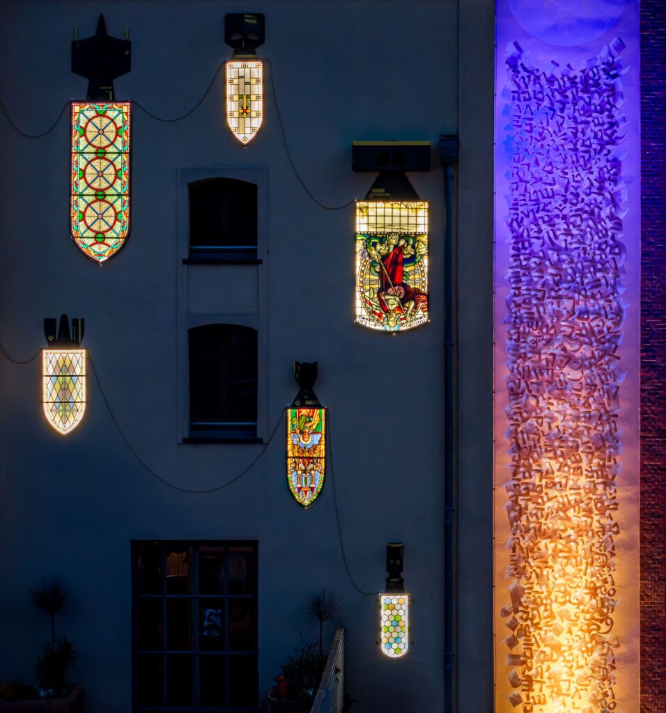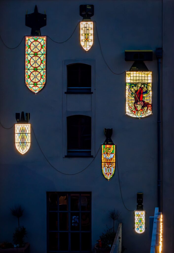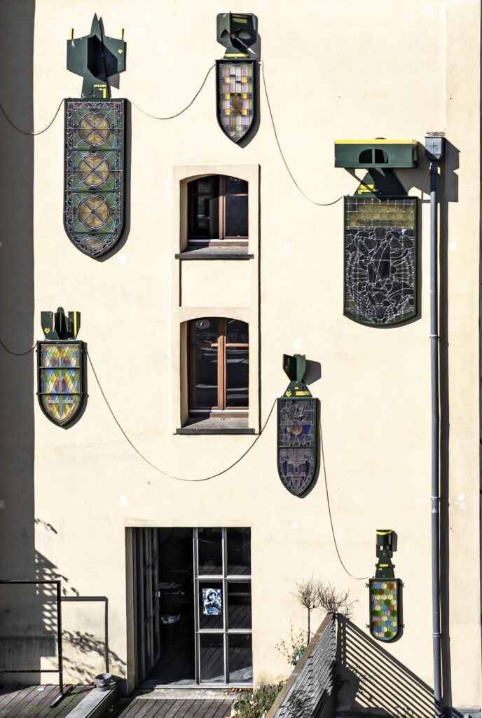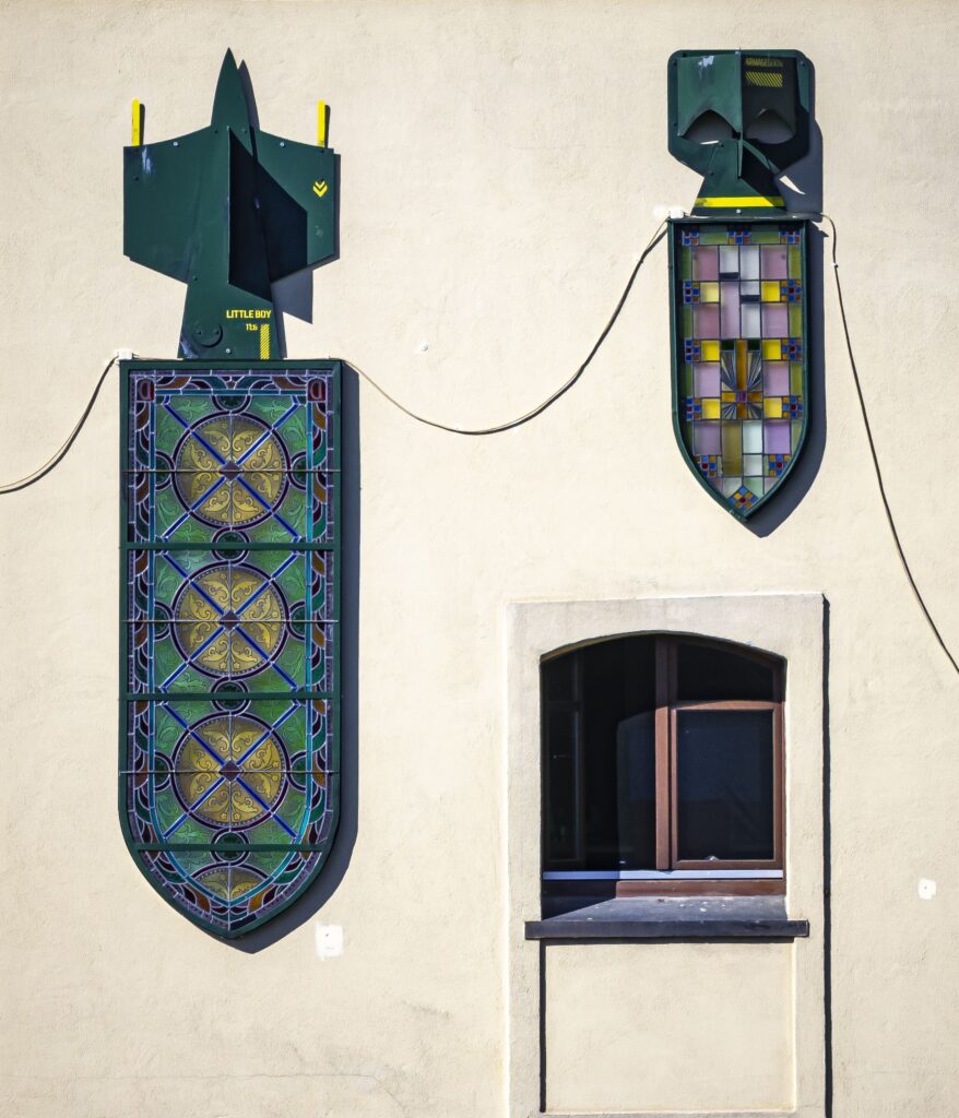 Die Installation „11:6“ ist ein radikaler Umdenk-Raum. Sie spielt mit der ikonischen Ästhetik von Kirchenfenstern, die in die Architektur sakraler Räume eingeschrieben sind. Farbig, lichtdurchflutet, spirituell erhebt sich der Blick an den Himmel. Doch wer nur beim ersten Blick verharrt, verpasst die ärgste Irritation. Die Fenster – Originale aus verschiedenen europäischen Kirchenhäusern – wurden umgedreht an Fassaden installiert. Form und Bedeutung geraten in ein erschütterndes Paradox: Wo einst Licht gen Himmel strebte, stürzt es nun zur Erde. Die Formation wirkt chaotisch, fallend, wie ein Hagel aus bunten, bombenhaften Glassplittern. Verstärkt wird dieses Gefühl durch Elemente, die an Lenksysteme von Fliegerbomben erinnern.