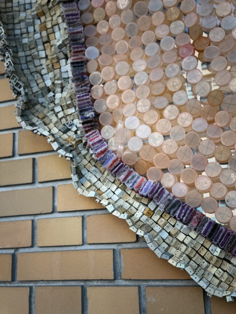 In PINK STONE verdichtet Moffat Takadiwa globale Konsumkreisläufe, koloniale Kontinuitäten und ökologische Gewalt zu einer kraftvollen materiellen Konstellation. Ausrangierte Computer- und Taschenrechnertasten, Plastikflaschenverschlüsse und Zahnbürstenköpfe, Objekte des Alltags, massenhaft produziert und achtlos entsorgt, werden zu einem skulpturalen Körper gefügt, der gleichermaßen an Gestein, Sediment oder archäologisches Relikt erinnert.