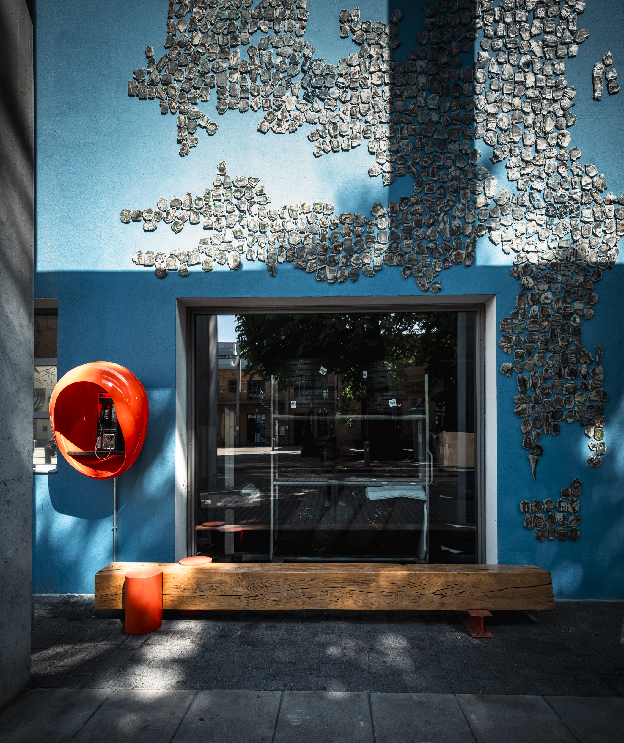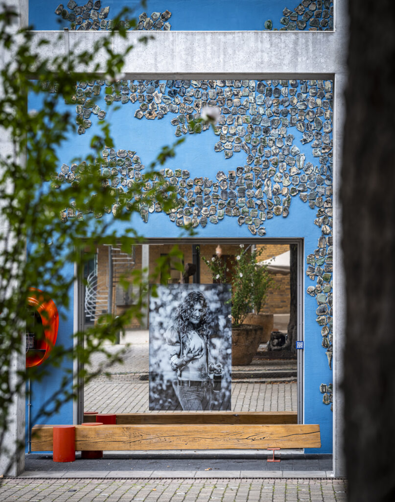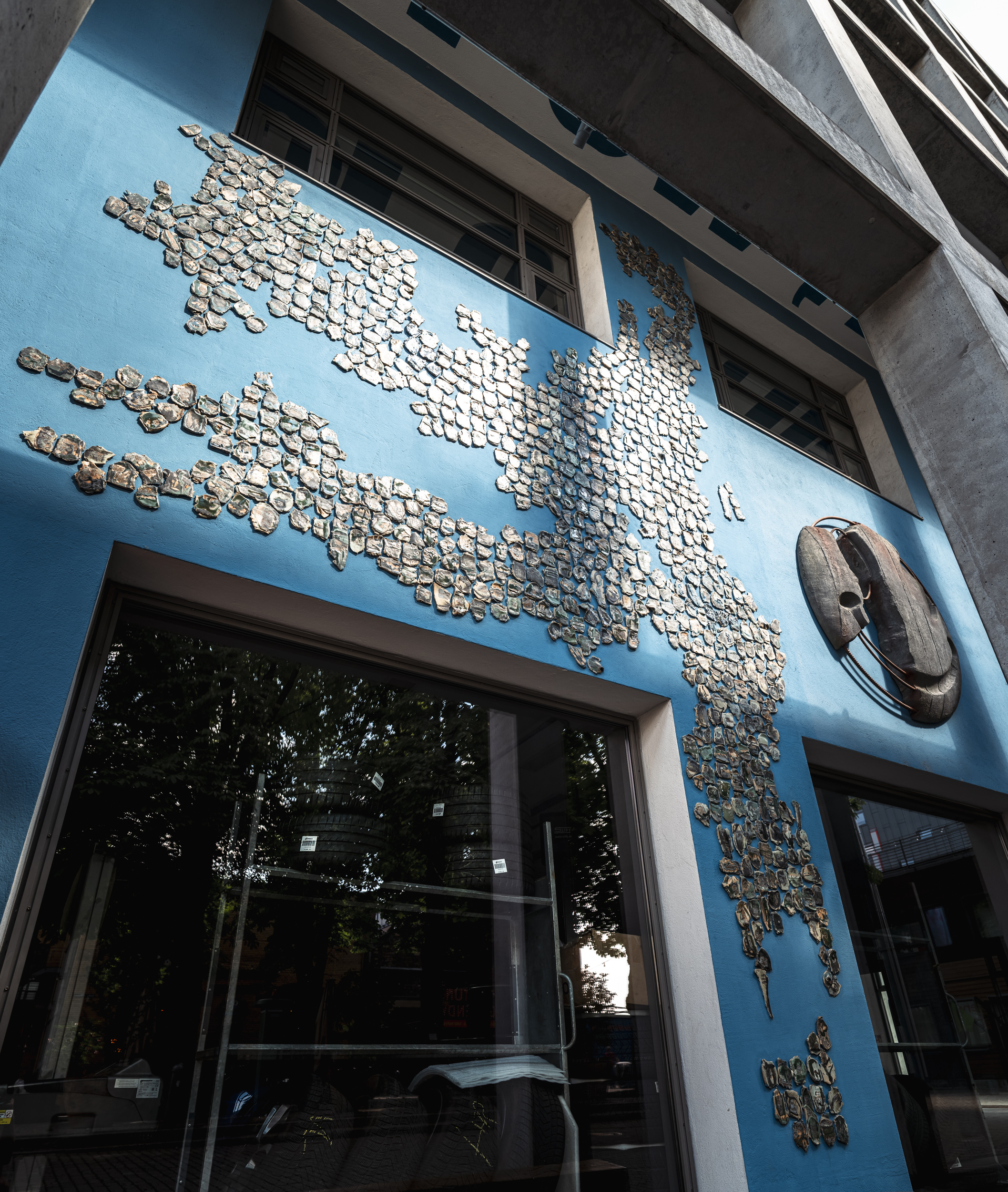 Wunderschöne, kleinteilige mosaikartig zusammengesetzte Keramikkacheln in blauer, türkiser Farbe und grauen Schriftzügen wurden von der iranischen Künstlerin in Handarbeit über vier Monate zu einem monumentalen Schriftbild für das Union-Areal erarbeitet. Der Titel Shore Zadeh, wörtlich „salzverkrustet“ oder „Salzspur“, beschreibt eine Oberfläche, auf der das Wasser längst verdunstet ist und nur das Salz als stille Erinnerung zurückbleibt. Diese feinen Spuren verweisen auf etwas Vergangenes, ohne es direkt zu erzählen. Sie markieren den Abdruck einer Abwesenheit, das Sichtbarwerden dessen, was nicht mehr da ist. In dieser Spannung zwischen Erinnerung und Leere, zwischen Präsenz und Verlust entfaltet sich die inhaltliche und formale Tiefe der Arbeit.