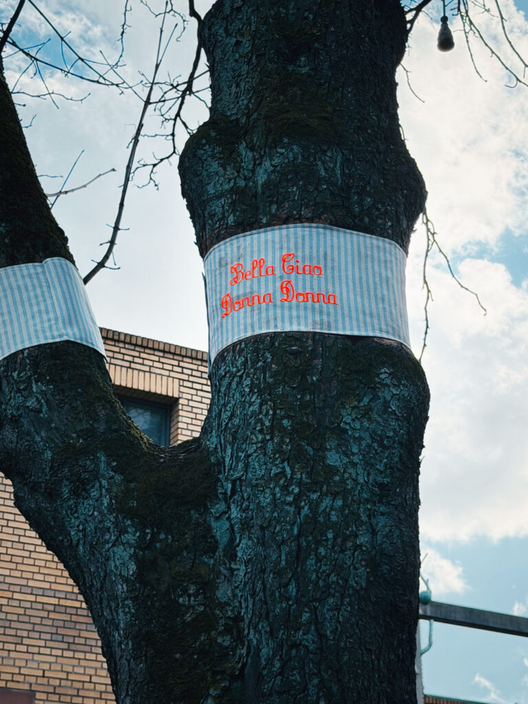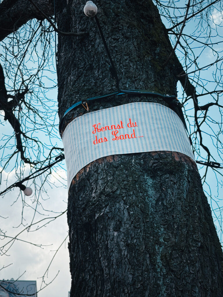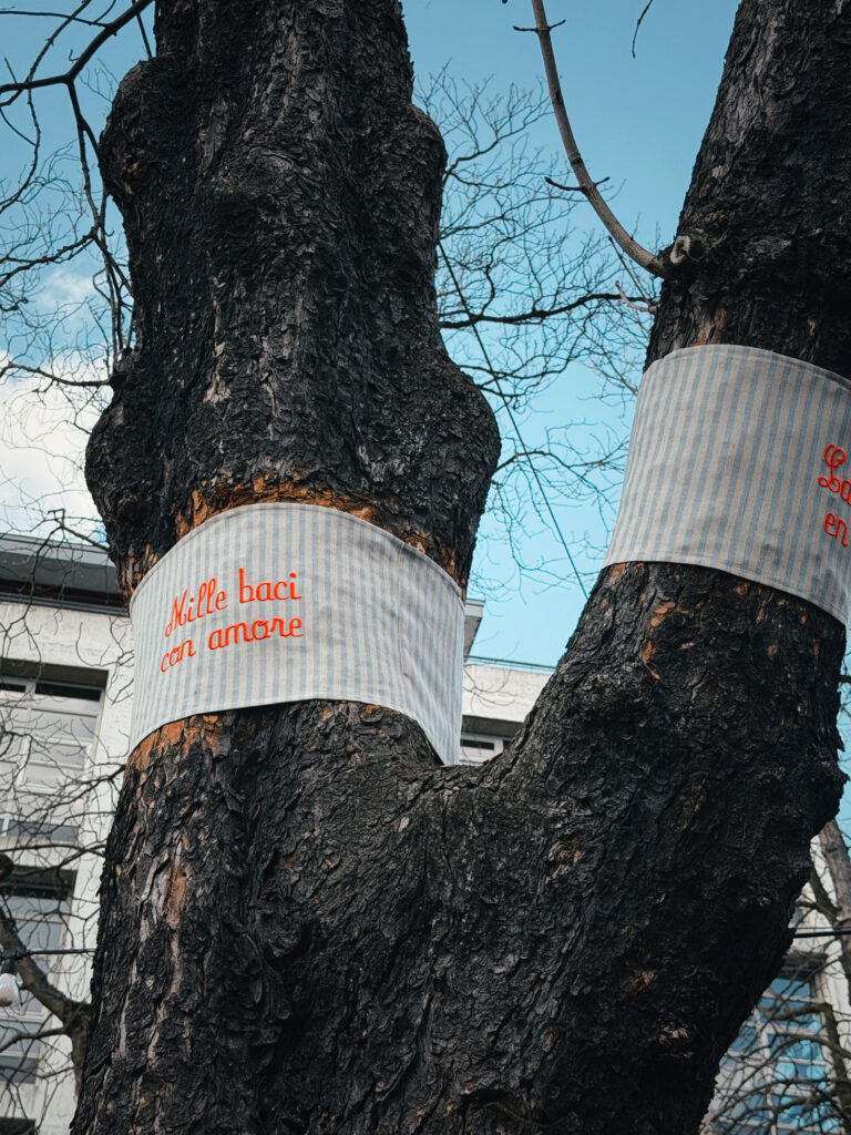 seven fabric ribbons with embroidered | words and sentences | height 35 cm, width 109 – 270 cm / 35 x 109 – 270 cm | installed on trees in a height of 2,70 meters to 3,80 meters