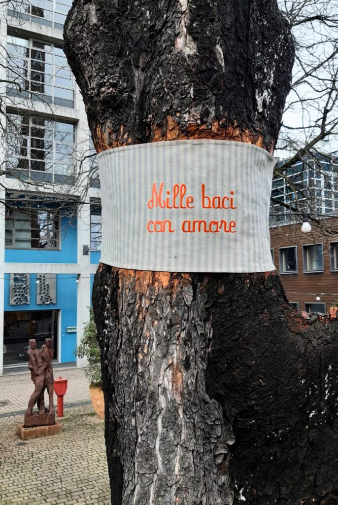 Mit dem Werk DAS LEBEN IST SCHÖN auf dem Union-Gelände spannt Stoffi van Stedel einen Bogen von der Vergangenheit über die Gegenwart bis in die Zukunft. Die verwendeten Stoffbinden sollen die Betrachtenden dazu ermutigen, trotz der Schwere der Vergangenheit – wie auch der Gegenwart – den Fokus auf Positives zu lenken und den Blick in eine hoffnungsvolle Zukunft zu richten.